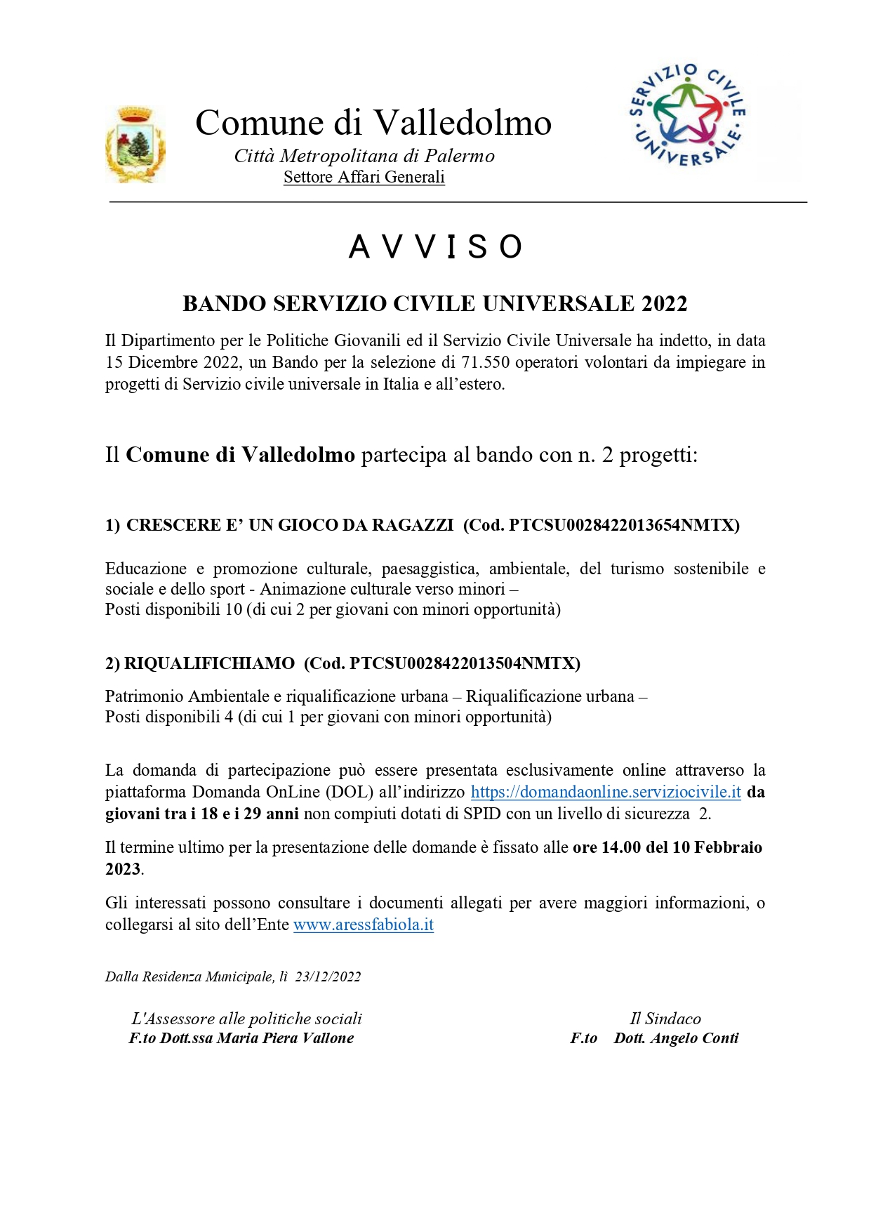 Bando Servizio Civile Universale - scadenza 10 febbraio 2023